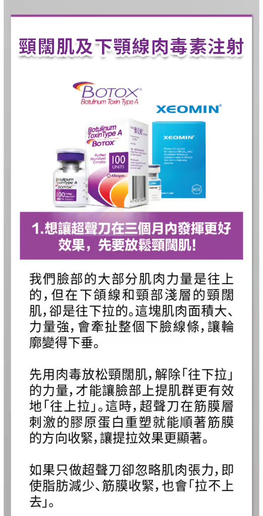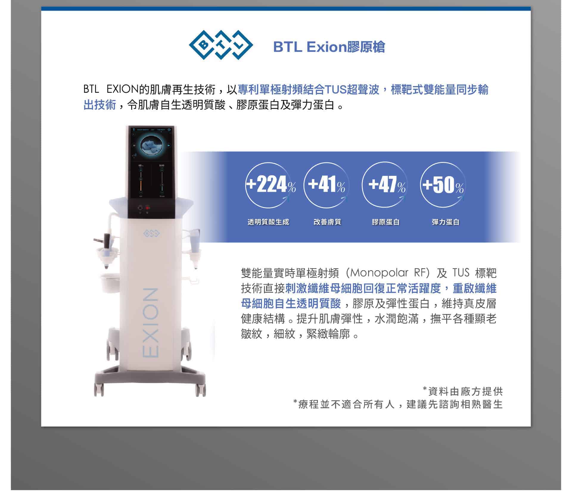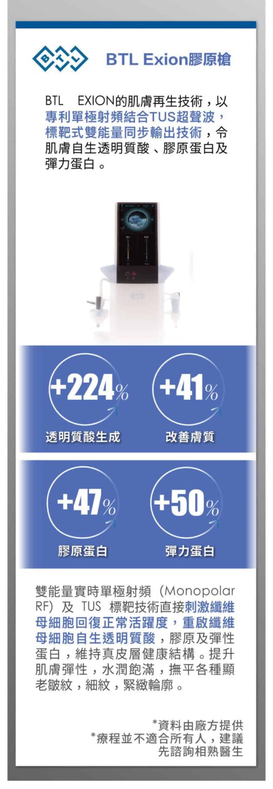 - 膠原蛋白激活疊加: Ulthera 刺激深層膠原蛋白,而 BTL Exion 加強表皮層的膠原增生,兩者相輔相成,效果更顯著。