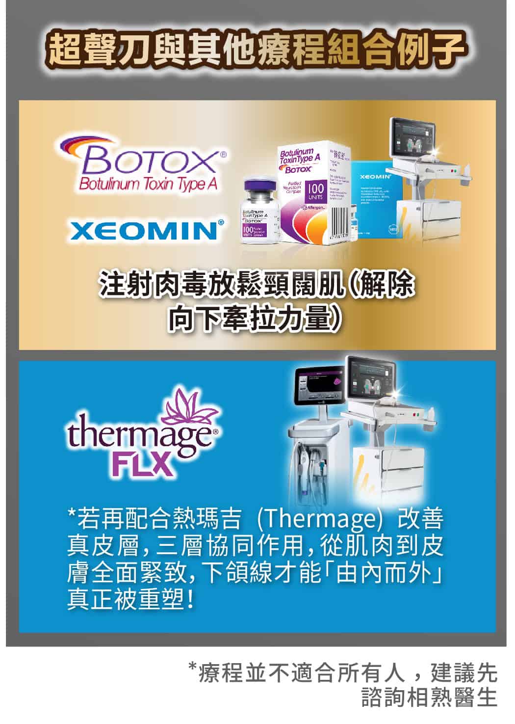 - 改善皮膚質地:Inmode的技術能改善皮膚的均勻度,而超聲刀則專注於緊緻,兩者結合可提升整體膚色和光滑度。