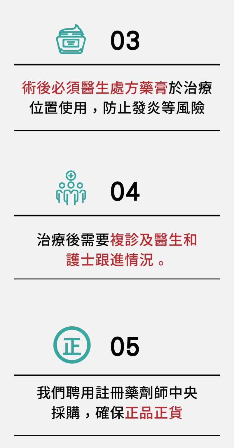 4.術後請加強保濕及防曬,建議塗抹SPF30以上防曬乳,選擇同時具有防曬黑(抗UVA)、曬傷(抗UVB),防止過度曝曬以免造成色素沉澱。
