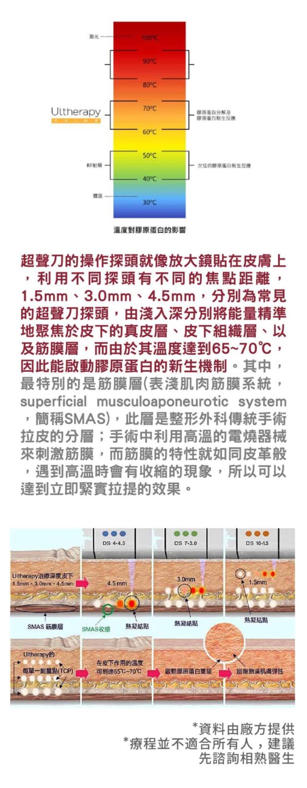 4.精準的深度與溫度是緊緻拉提治療的重大關鍵:美國原廠Ulthera® 高能量聚焦超聲刀能為您精確的控制這兩項治療關鍵。